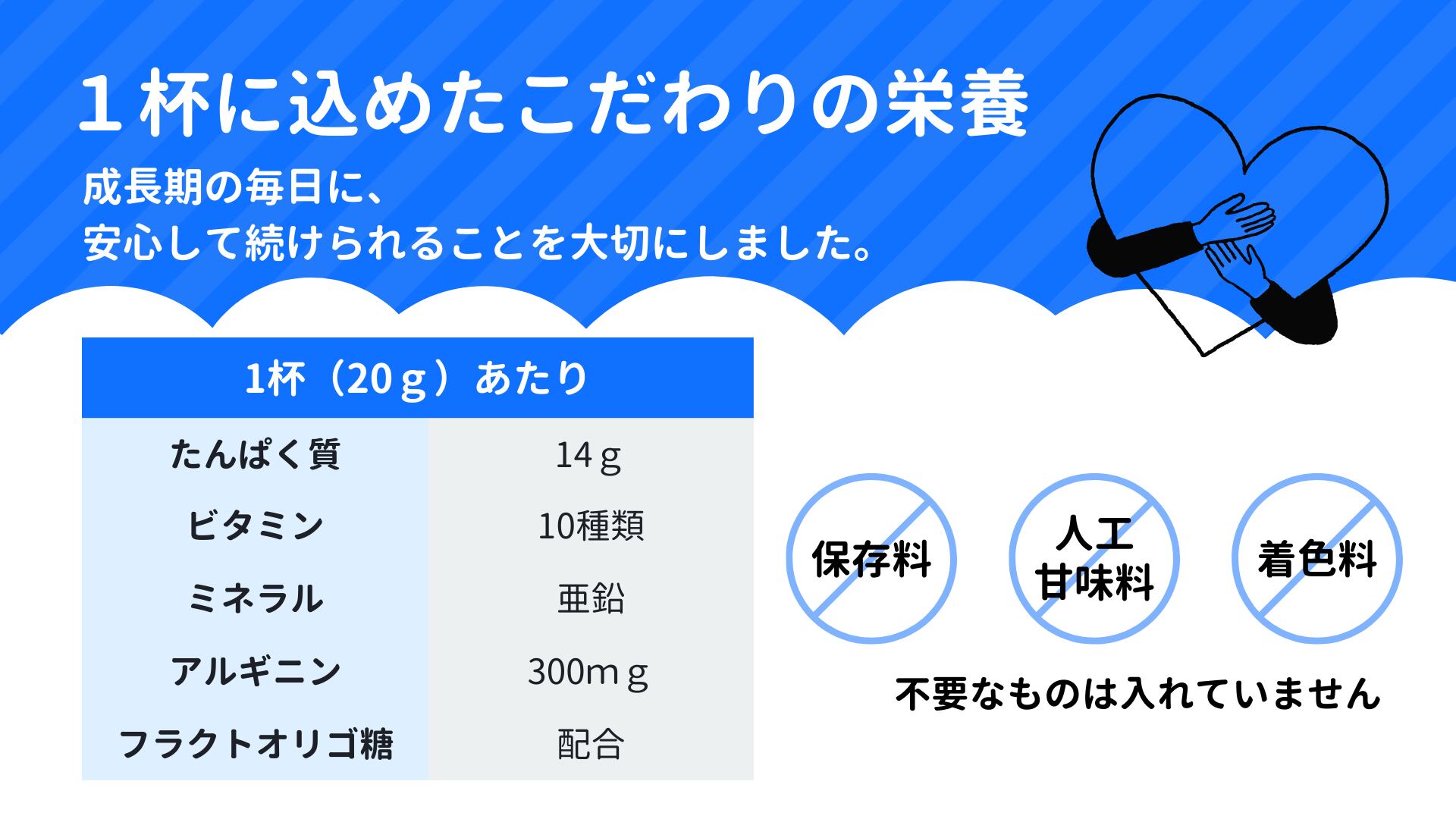 “伸びる時期”を逃さない。成長ホルモンの働きを助けるアミノ酸“アルギニン”を配合。