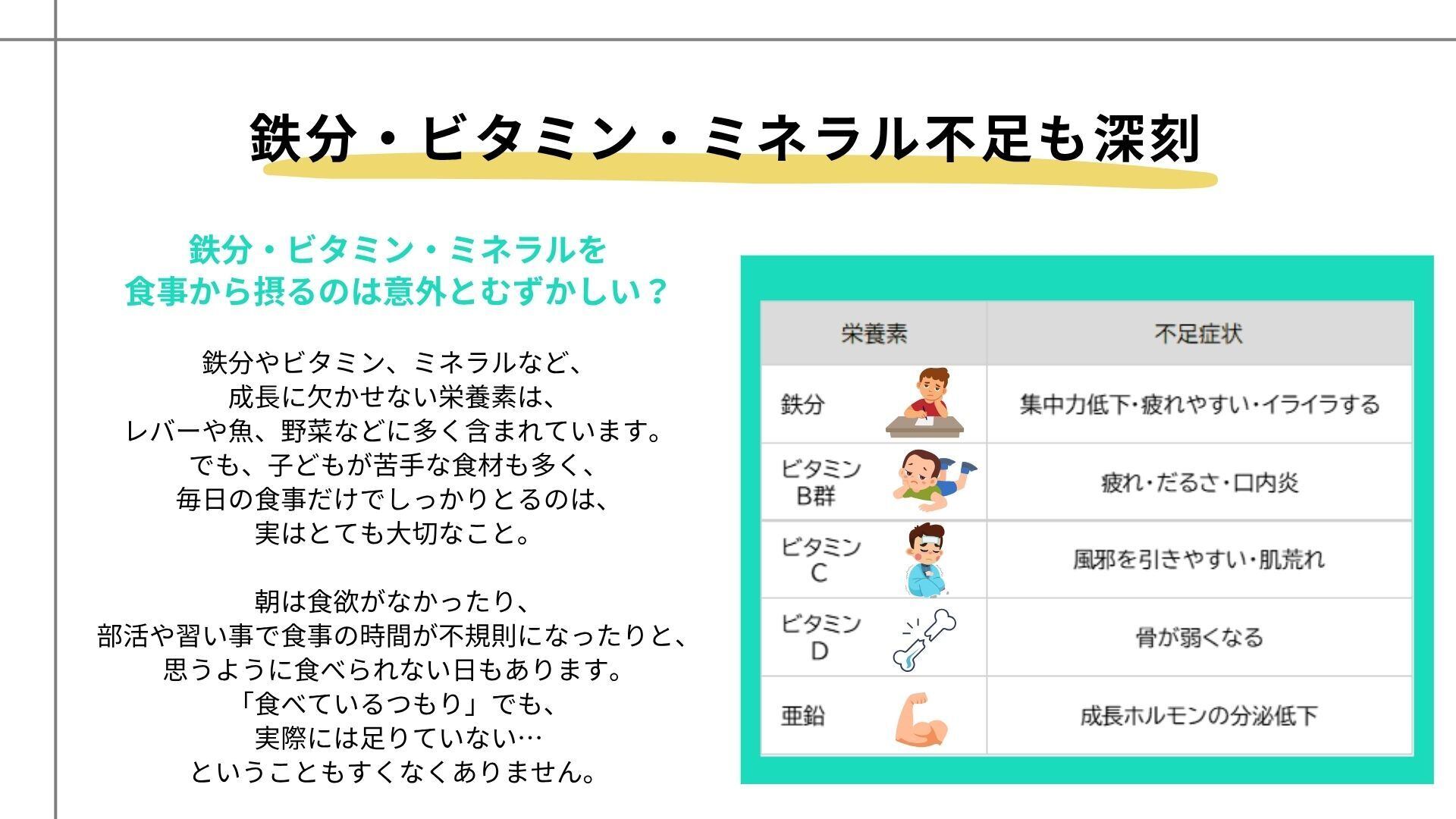 たんぱく質だけでなく、栄養バランスもとても大切。でも実際食事だけで補いきれない現状。